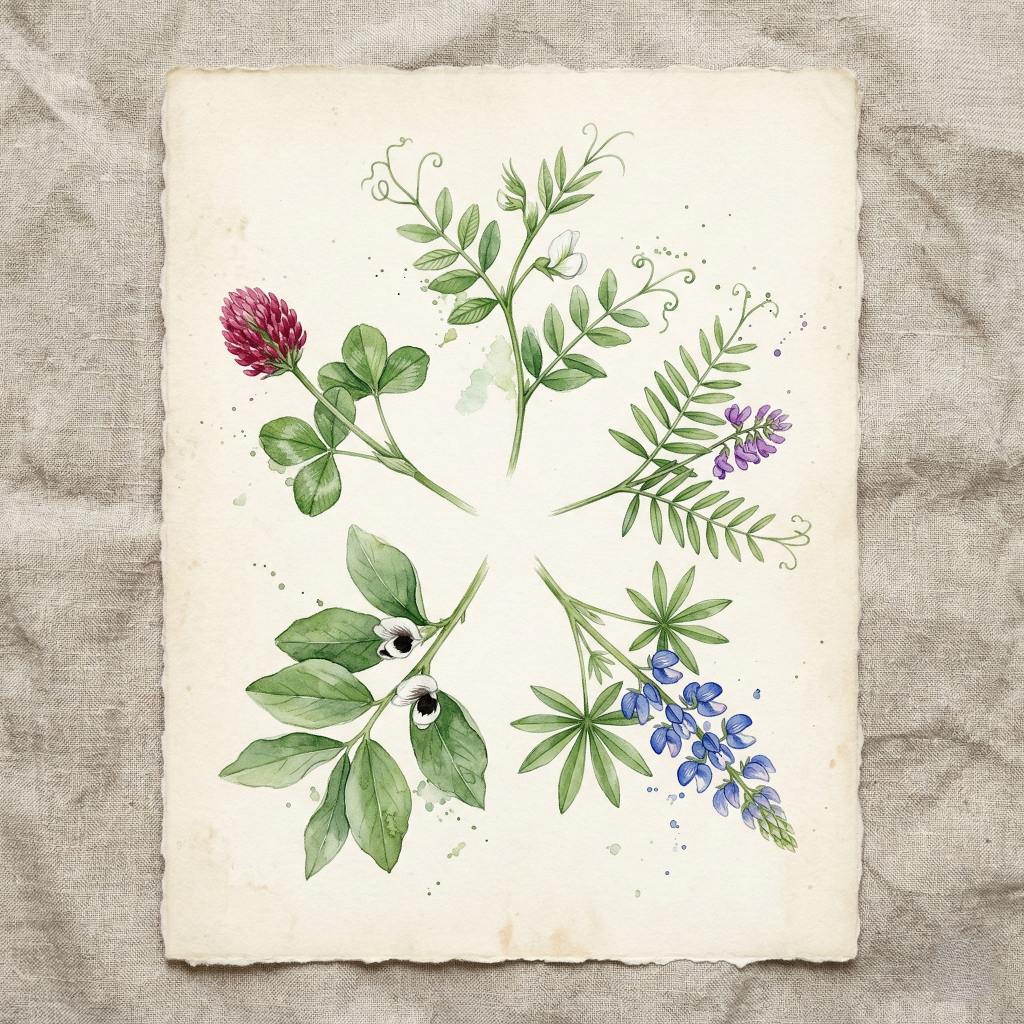 Botanical name: Pisum sativum, Trigonella foenum-graecum, Pisum sativum, Trifolium pratense, Medicago sativa